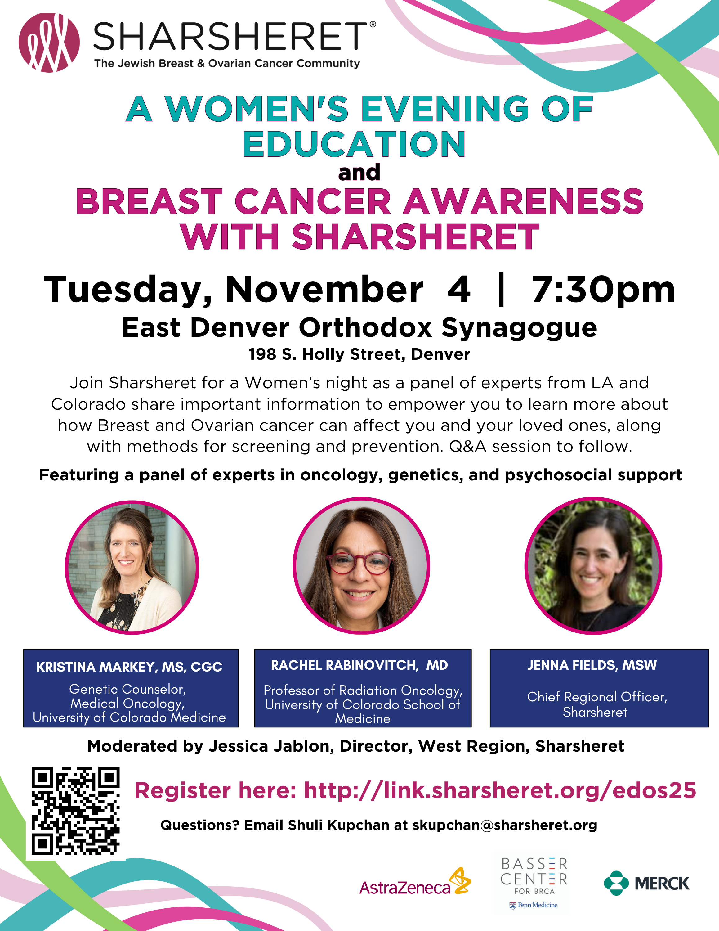 Join Sharsheret for a Women’s night as a panel of experts from LA and Colorado share important information to empower you to learn more about how Breast and Ovarian cancer can affect you and your loved ones, along with methods for screening and prevention. Q&A session to follow.
