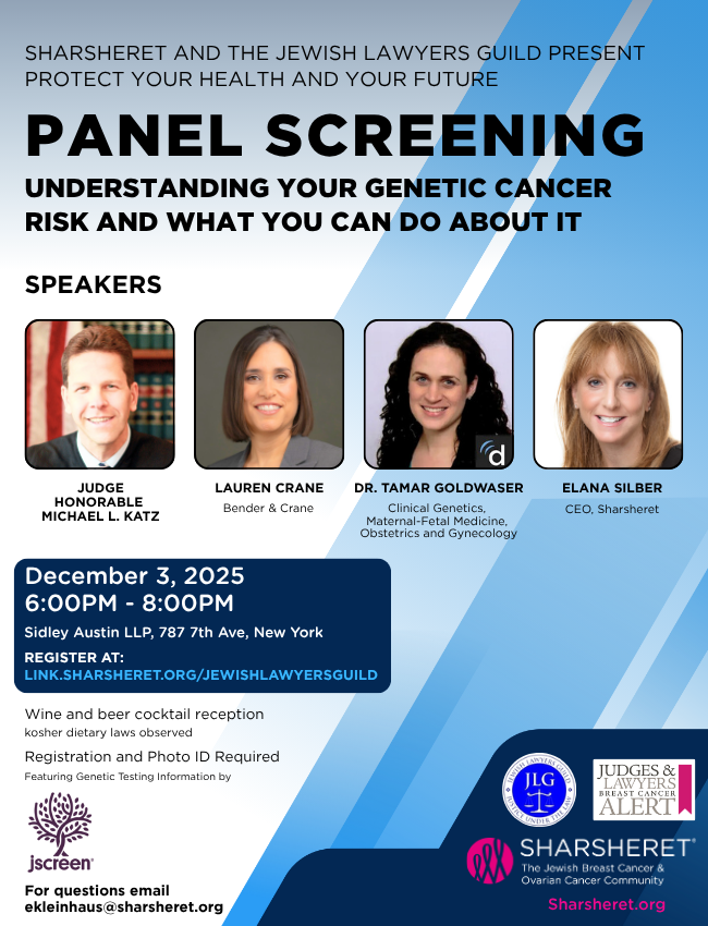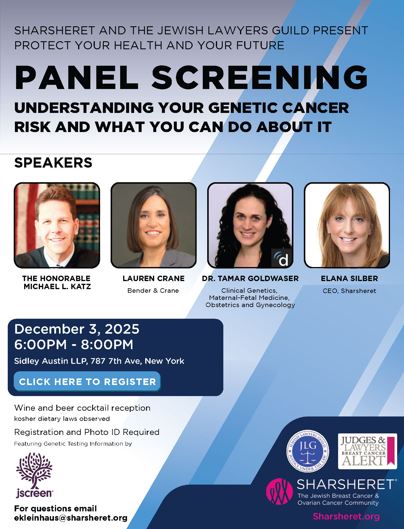 Sharsheret and the Jewish Lawyers Guild presents an evening of awareness and education. Registration and photo ID are required.