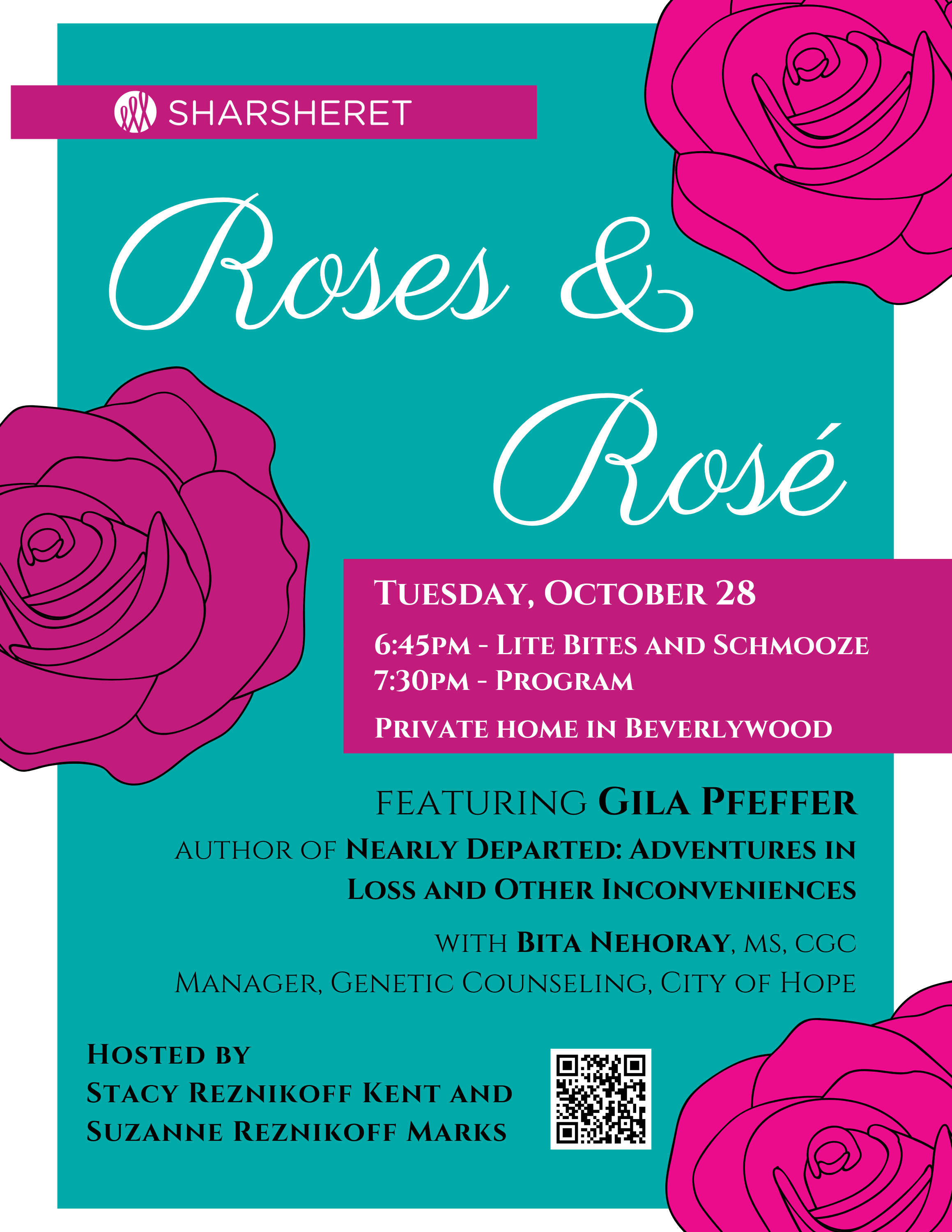 Roses and Rosé was conceived as a celebration of a culmination of a year that was guided by the daily response to breast cancer treatment. Creating a special evening for the people that supported us while we were supporting Suzanne is the best way we can express our gratitude and share what we’ve learned along the way. Please join us on October 28th to learn and laugh, and help us acknowledge and appreciate having options to navigate our genetic health.